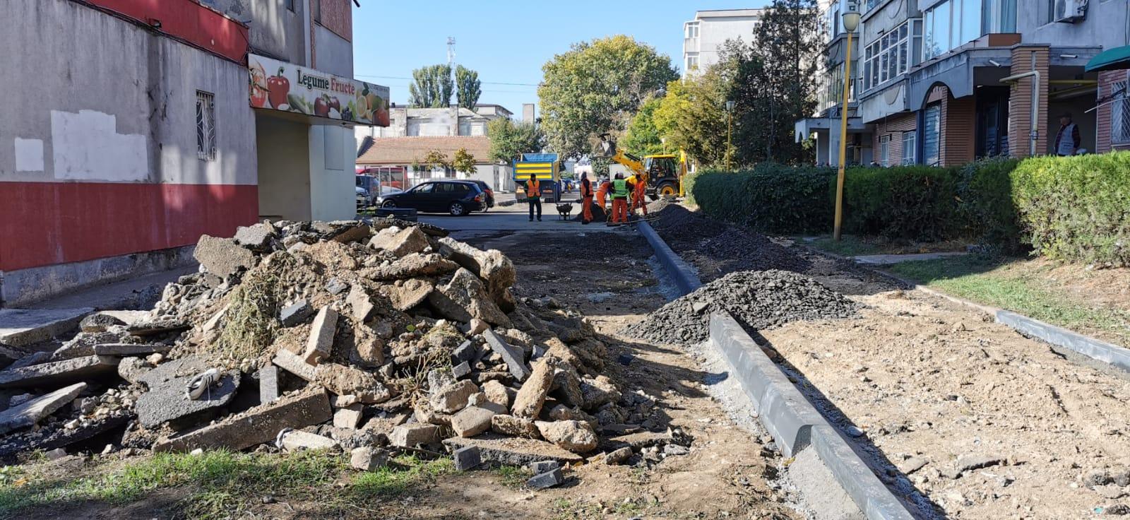 Similar, pe aleea Timonei, angajații SC Confort Urban SRL lucrează la reamenajarea zonei ce împrejmuiește spațiul destinat celor mici. Pavajul montat pe aleile pietonale și bordurile moderne vor transforma locul de joacă într-un spațiu sigur pentru cei mici.