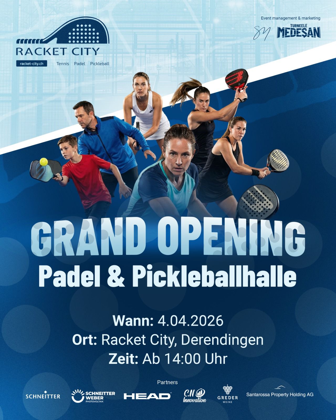 Pe 4 aprilie, la Racket City din Derendingen, va avea loc evenimentul oficial de deschidere al bazei sportive dedicate padelului și pickleballului. Proiectul îl are pe Sergiu Medeșan în rol de manager și specialist în marketing sportiv, acesta fiind implicat în coordonarea activităților sportive și în dezvoltarea competițiilor ce vor avea loc în cadrul clubului.