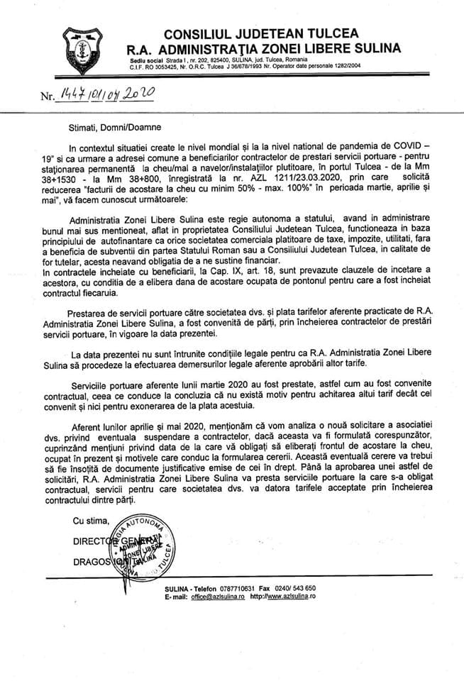 Nu doar concesionarii de plaje de pe litoralul românesc reclamă situaţia delicată în care se află – statul român le interzice să desfăşoare activităţi, dar acelaşi stat român le cere bani pe care este evident că nu îi pot câştiga în această perioadă –, ci şi transportatorii pe apă din Tulcea. Conform unui apel susţinut de mai mulţi operatori de turism din Tulcea, se solicită „înjumătăţirea facturilor pe luna martie, de când a intrat în vigoare starea de urgenţă” – facturi pe care cei care derulează transport pe apă (în scop turistic) trebuie să le achite Administraţiei Zonei Libere Sulina (AZL). „Solicităm public ca pe întreaga perioadă a stării de urgenţă facturile să fie măcar înjumătăţite – considerăm ca este echitabil pentru ambele părţi – pentru că şi la AZL lucrează oameni care trebuie plătiţi. Este datoria dvs. să găsiţi soluţia, nu a oamenilor care investesc în bărci, pontoane şi în turism pentru a vă plăti vouă salariile (…)”, se arată în luarea de poziţie a agenţilor economici tulceni.