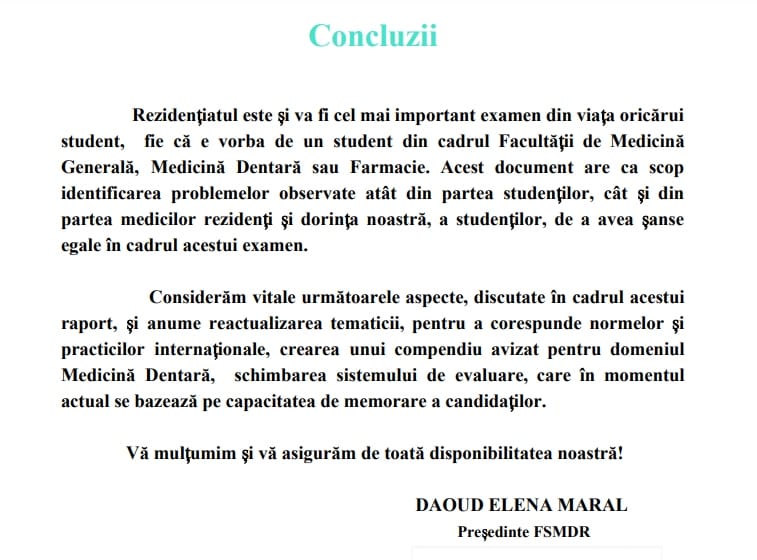 „Reiterăm importanţa Examenului de Rezidenţiat, ce reprezintă nu doar culminarea unui lung parcurs de studiu, ci şi o etapă crucială în cariera medicală. În forma sa actuală, examenul nu reflectă întreaga competenţă obţinută de studenţii din domeniul medical, ci poate doar determinarea şi perseverenţa viitorilor medici de a trece cu bine de acest moment decisiv în cariera lor. Dorinţa tuturor studenţilor, de care întregul sistem medical va beneficia, este ca examenul de rezidenţiat să devină un proces gradual şi bine fundamentat de educaţie şi nu doar un moment de trecere către o nouă etapă în pregătirea medicală continuă„, a precizat FASMR.