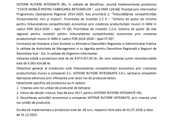 SISTEME RUTIERE INTEGRATE SRL, în calitate de Beneficiar, anunță implementarea proiectului "STAȚIE MOBILĂ PENTRU FABRICAREA BETOANELOR", cod SMIS 124168, finanţat ...