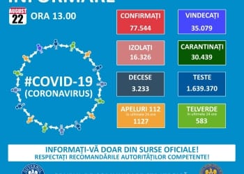 Până sâmbătă, 22 august, a.c., pe teritoriul României, au fost confirmate 77.544 de cazuri de persoane infectate cu noul coronavirus ...