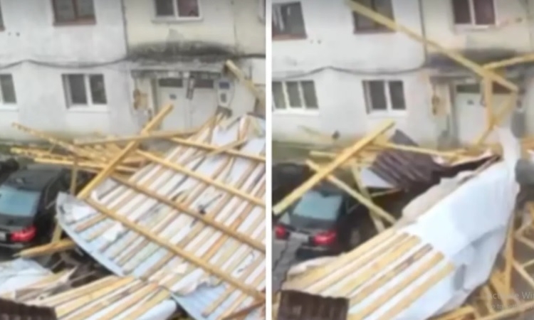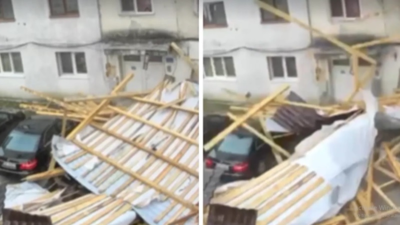 Scene dramatice au fost surprinse în Bistrița. Vântul a fost atât de puternic încât a smuls cu totul acoperișul unui bloc și l-a aruncat într-o parcare din apropiere. Momentul a fost surprins de camerele de supraveghere.