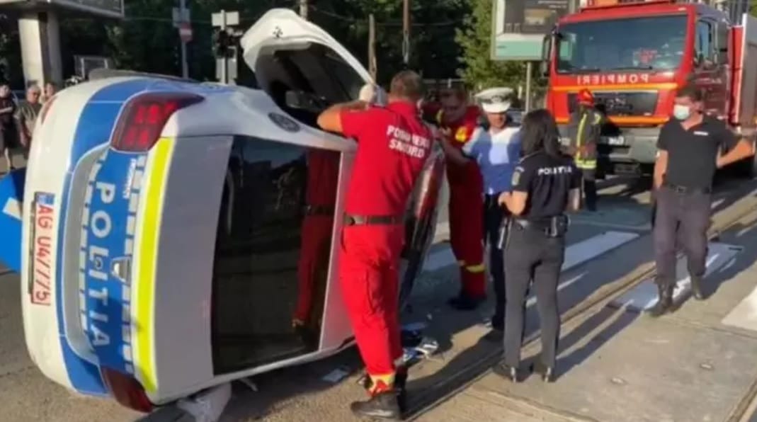 Un polițist a vrut să evite aglomerația din intersecție și a pornit semnalele acustice și luminoase. În scurt timp a produs un accident și s-a răsturnat cu mașina Poliției.