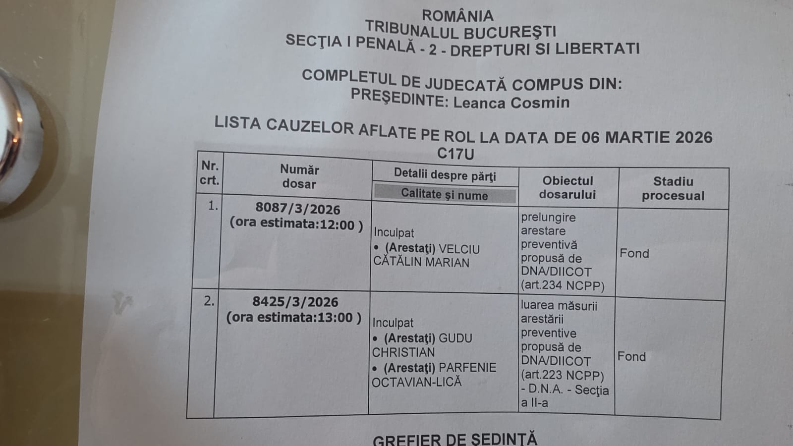 În dosarul 8425/3/2026 s-a admis în parte propunerea formulată de DNA. S-a dispus arestarea preventivă a inculpatului Parfenie Octavian-Lică pe o durata de 30 de zile, începând cu data de 06.03.2026 până la data de 04.04.2026, inclusiv. S-a dispus respingerea propunerii de arestare preventivă a inculpatului Gudu Christian și luarea față de inculpat a măsurii controlului judiciar pe o perioadă de 60 de zile, începând cu data de 06.03.2026 până la data de 04.05.2026, inclusiv.