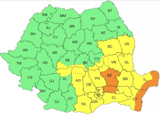 O avertizare Cod galben vizează Dobrogea, sudul și estul Munteniei, precum și centrul și sudul Moldovei, unde vântul va continua să aibă intensificări cu rafale de 50-70 km/h. Aceasta este în vigoare de joi de la ora 10.00 până vineri la ora 5.00.