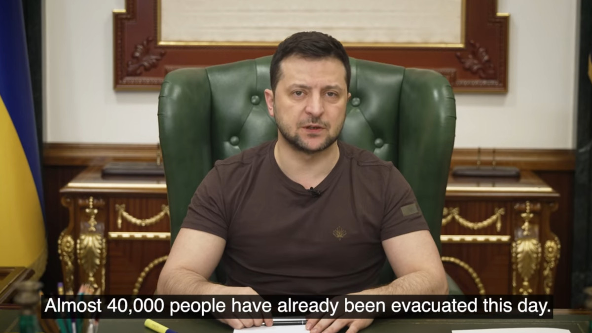 Președintele Ucrainei, Volodimir  Zelenski a transmis într-un mesaj video postat pe pagina sa de Facebook că, una dintre principalele activități ale zilei de joi a fost organizarea coridoarelor umanitare din Sumî, Trosteaneţ, Krasnopillea, Irpin, Bucea, Gostomel și Izium. Populația civilă – aproximativ 40.000 de persoane au ajuns în siguranţă în orașele Poltava, Kiev, Cerkasî, Zaporojie, Dnipropetrovsk, Liov.