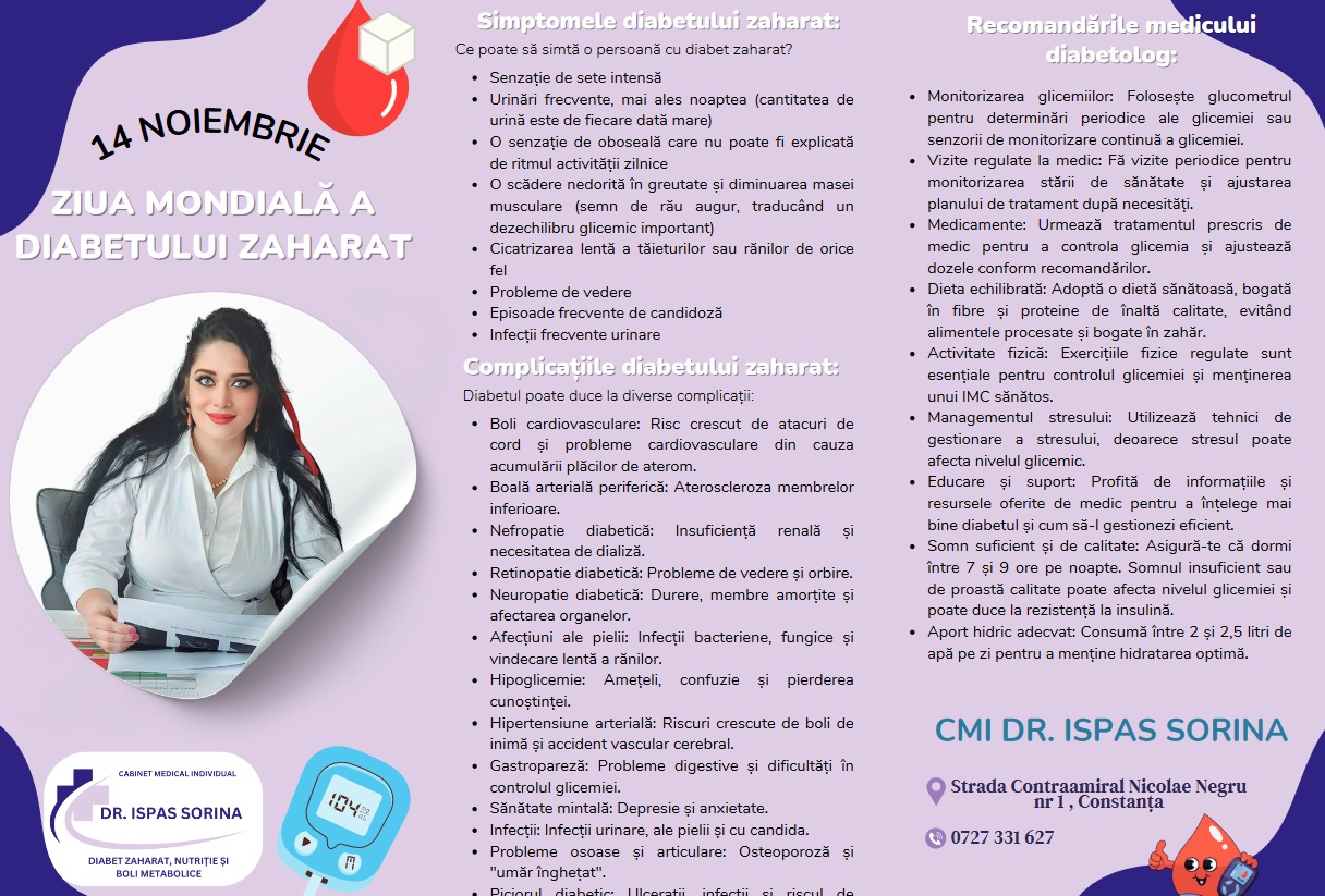 Dr. Sorina Ispas: Astăzi, 14 noiembrie, este o zi atât de importantă pentru noi, medicii diabetologi. De ce? Pentru că noi ne dorim informarea populației. Ne dorim sesiuni de comunicare prin care putem să dăm un plus valoare acestei zile importante. Diabetul zaharat este o boală cronică. Este o boală care nu se simte. În momentul când apare simptomatologia, deja trebuie să ne punem un semn de întrebare. Dacă este diabet de tip 1, el poate să aibă un debut brutal, care poate începe direct cu o comă sau diabetul zaharat de tip 2, care foarte mult timp este nediagnosticat. Pacientul se poate prezenta la medic sau la screening, deoarece noi facem screening în Constanța și în județul Constanța. Așa am depistat foarte multe cazuri noi de diabet zaharat. Ce simptome au prezentat pacienții? Gură uscată. Marea majoritate a persoanelor spun că au gura uscată și că le este foarte sete. Noaptea merg foarte des la toaletă. Aceste urinări frecvente sunt din cauza unei simptomatologii specifice diabetului zaharat. De aceea ei vor simți nevoia și să bea foarte multă apă. Deshidratându-se, ei beau multă apă și au gura uscată.