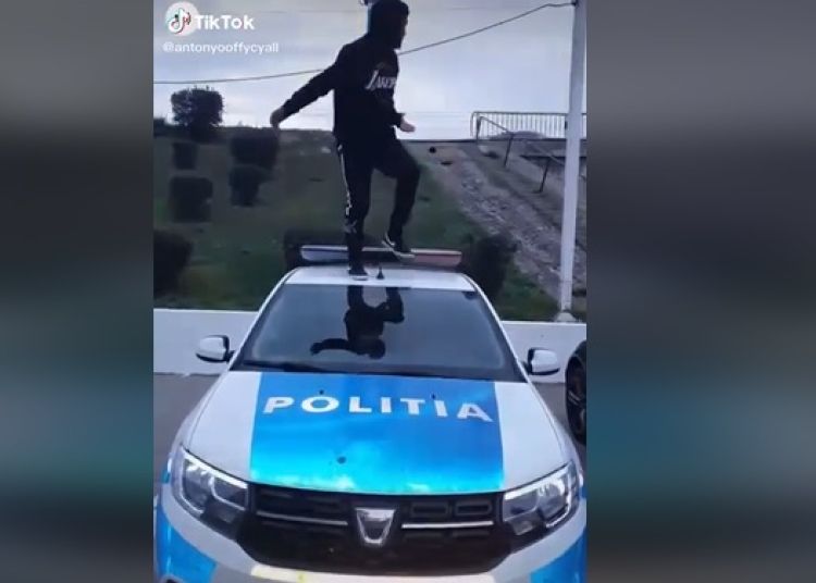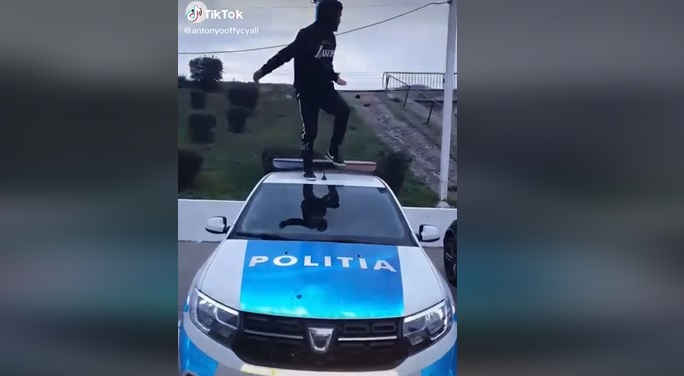 În imaginile postate pe o reţea de socializare se observă cum un tânăr se afla în picioare pe maşina de poliţie, iar apoi coboară de pe aceasta prin partea din faţă, potrivit știripesurse.ro.