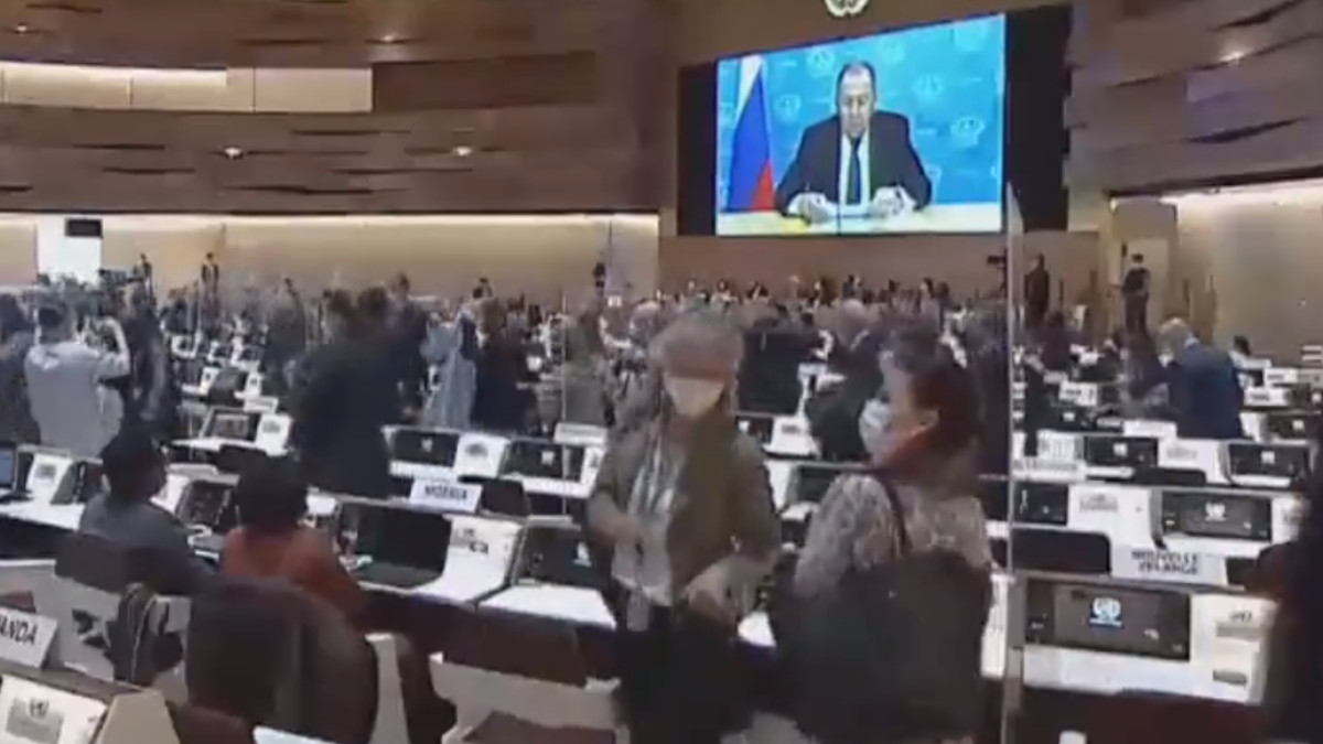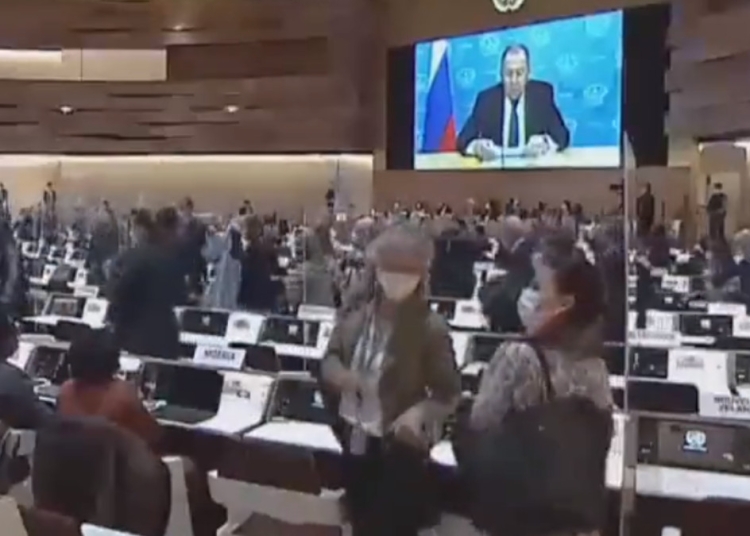 În timpul conferinței ONU pentru drepturile omului la care ministrul rus de externe Serghei Lavrov a participat online, din cauza interdicțiilor de zbor din Rusia, zeci de diplomați din Uniunea Europeană, Statele Unite și Marea Britanie au ieșit din sală, în semn de boicot.