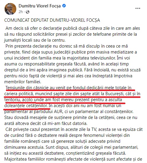 Pe pagina sa de Facebook, Focșa susține că gestul său incalificabil, de a-și agresa soția, vine pe fondul unor tensiuni cumulate din cauză că a muncit prea mult ca parlamentar.